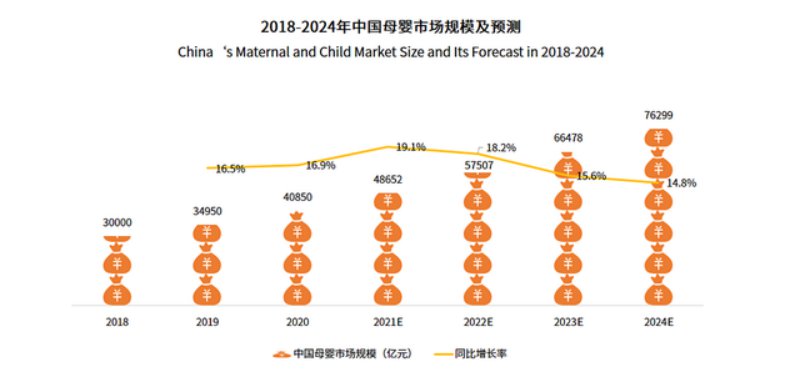 據艾媒咨詢(xún)數據顯示,2021年中國母嬰市場(chǎng)規模已超過(guò)48000億元,預計到2024年市場(chǎng)規模將增至75460億元。目前市場(chǎng)規模年均復合增長(cháng)率在47%左右,隨著(zhù)三孩政策的推進(jìn),市場(chǎng)規模也會(huì )隨之增長(cháng)。