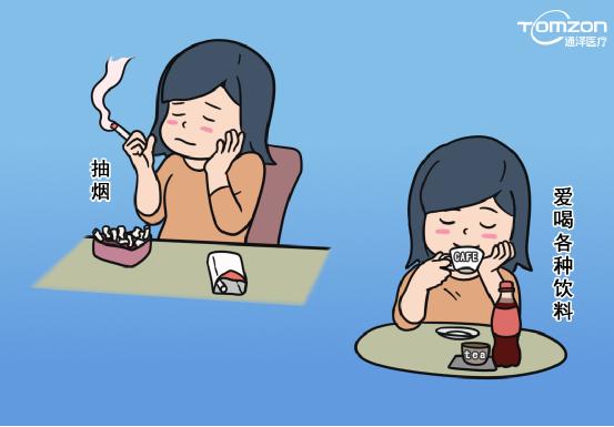 不良生活方式。相關(guān)的生活方式有:每日吸煙 20 支以上、愛(ài)好喝茶、愛(ài)喝咖啡、愛(ài)喝碳酸飲料等。