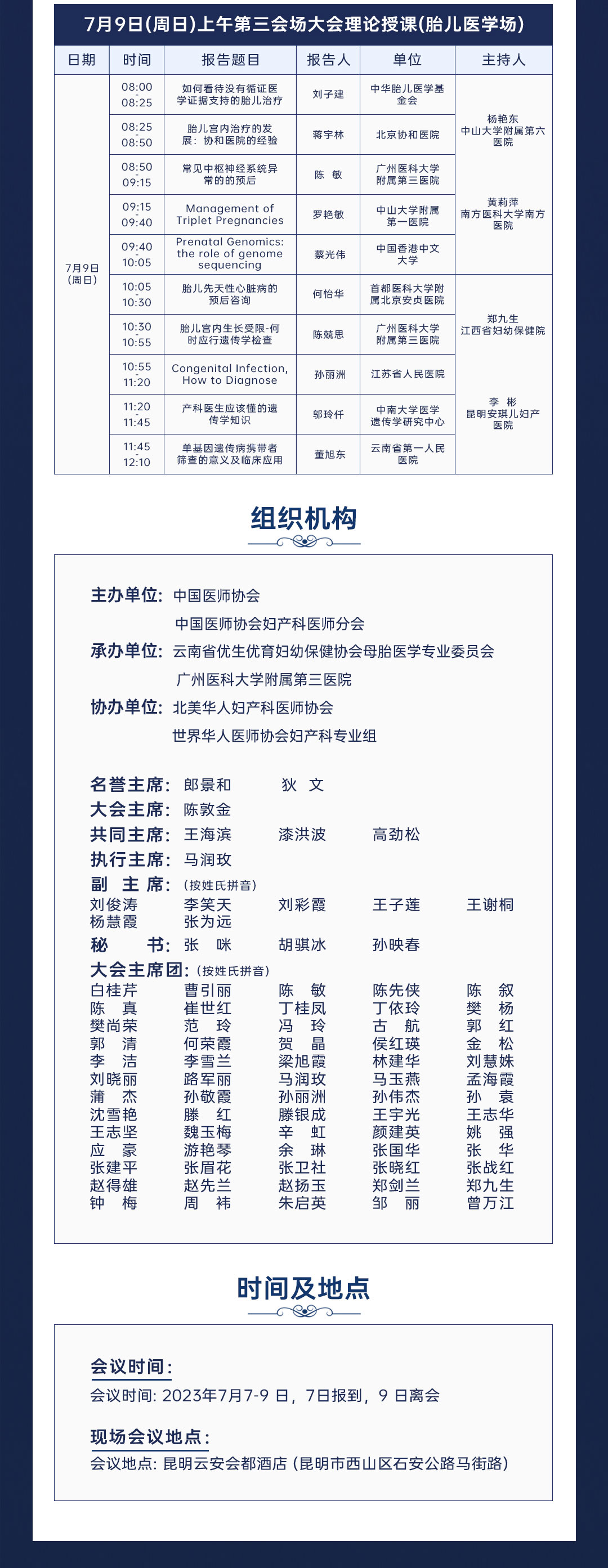 本次大會(huì )由中國醫師協(xié)會(huì )、中國醫師協(xié)會(huì )婦產(chǎn)科醫師分會(huì )主辦,云南省優(yōu)生優(yōu)育婦幼保健協(xié)會(huì )母胎醫學(xué)專(zhuān)業(yè)委員會(huì )、廣州醫科大學(xué)附屬第三醫院承辦,北美華人婦產(chǎn)科醫師協(xié)會(huì )、世界華人醫師協(xié)會(huì )婦產(chǎn)科專(zhuān)業(yè)組協(xié)辦。