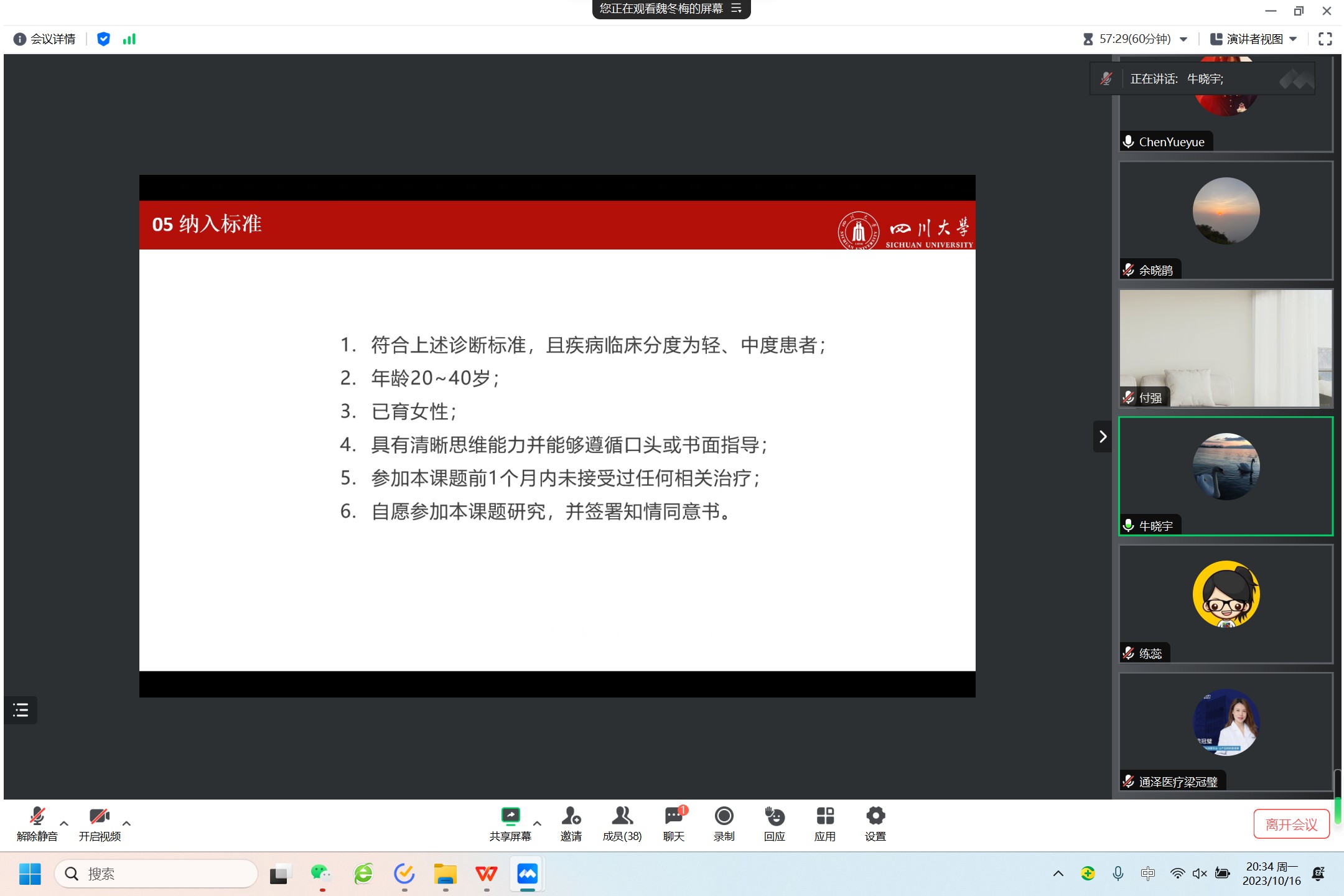 2023年10月16日,由四川大學(xué)華西第二醫院主辦、通澤醫學(xué)技術(shù)研究院承辦的《TEAS聯(lián)合經(jīng)陰道生物反饋電刺激治療女性壓力性尿失禁臨床研究》項目啟動(dòng)會(huì )通過(guò)騰訊會(huì )議線(xiàn)上順利召開(kāi)。晚上8點(diǎn)項目負責人牛曉宇副院長(cháng)致辭并宣布啟動(dòng)會(huì )正式開(kāi)始。